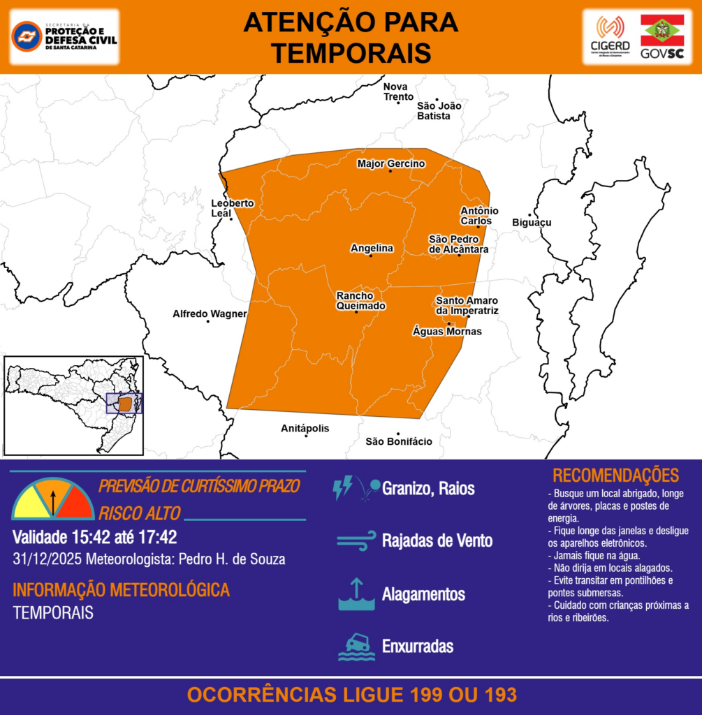 ATENÇÃO – 31/12 15:42 – TEMPORAIS com RAJADAS DE VENTO, ALAGAMENTOS, GRANIZO, RAIOS e risco de ENXURRADAS para áreas da região da Grande Florianópolis nas próximas 2 horas. Ocorrências ligue 199 ou 193.