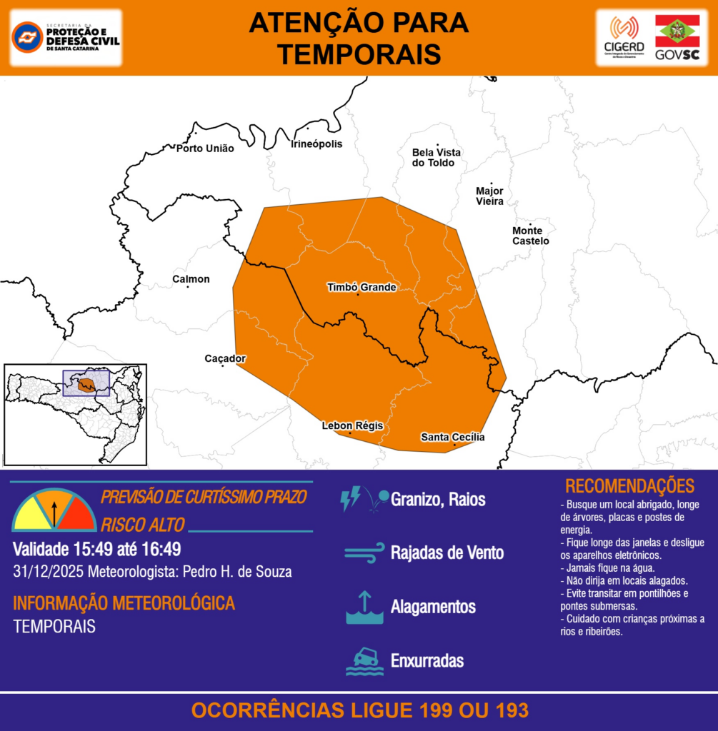 ATENÇÃO – 31/12 15:49 – TEMPORAIS com RAJADAS DE VENTO, ALAGAMENTOS, GRANIZO, RAIOS e risco de ENXURRADAS para os municípios de Bela Vista do Toldo, Calmon, Caçador, Irineópolis, Lebon Régis, Major Vieira, Monte Castelo, Porto União, Santa Cecília e Timbó Grande na próxima hora. Ocorrências ligue 199 ou 193.