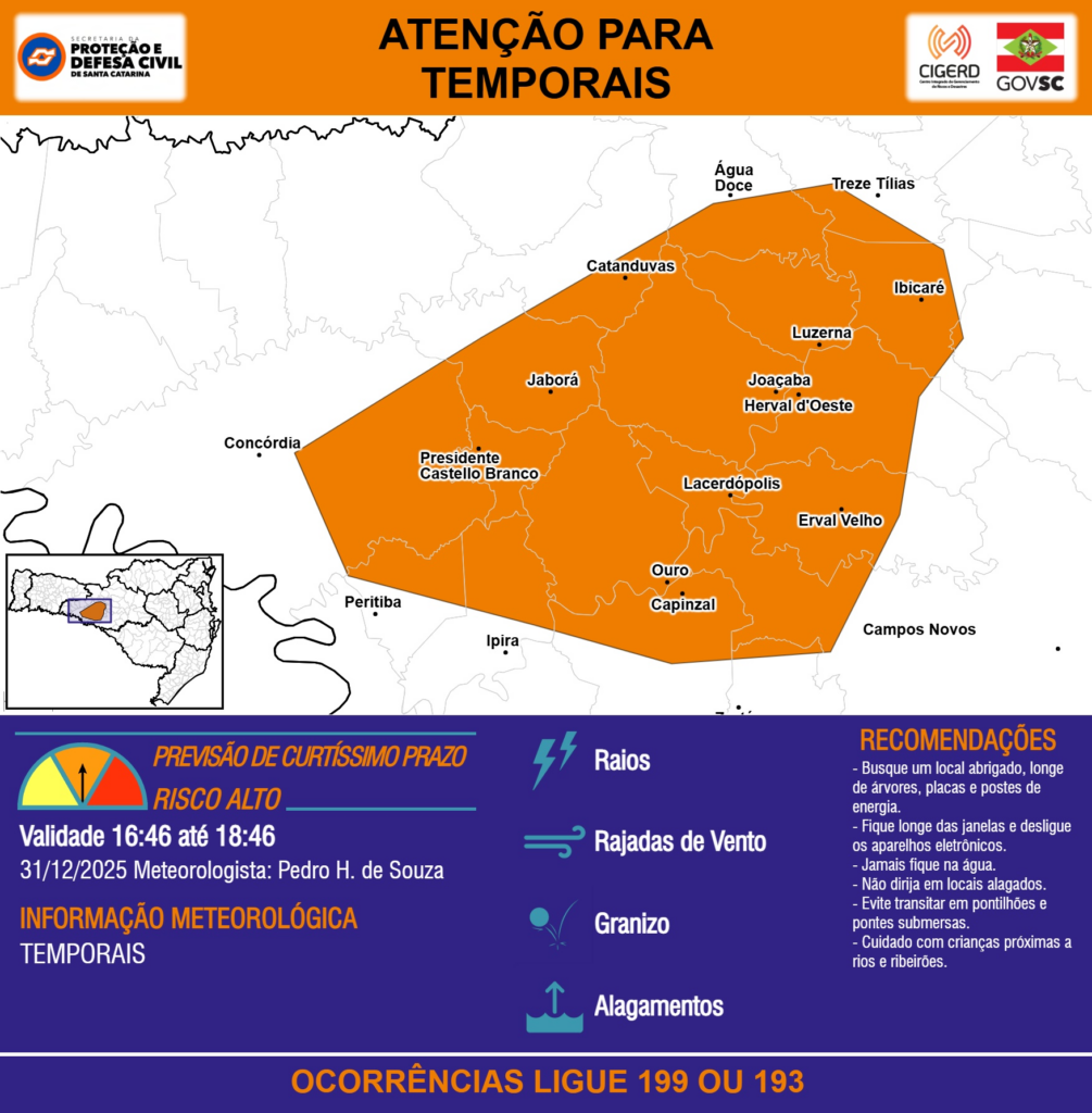 ATENÇÃO – 31/12 16:46 – TEMPORAIS com RAIOS, RAJADAS DE VENTO, GRANIZO e ALAGAMENTOS para áreas da região do Meio-Oeste nas próximas 2 horas. Ocorrências ligue 199 ou 193.