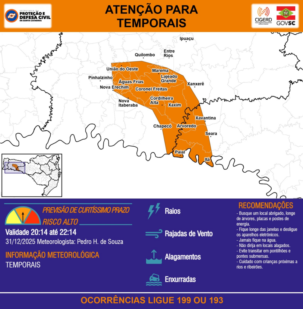 ATENÇÃO – 31/12 20:14 – TEMPORAIS com RAIOS, RAJADAS DE VENTO, ALAGAMENTOS e risco de ENXURRADAS para áreas das regiões do Oeste e Meio-Oeste nas próximas 2 horas. Ocorrências ligue 199 ou 193.