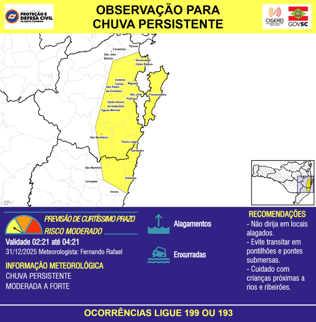 OBSERVAÇÃO – 31/12 02:21 – CHUVA PERSISTENTE de intensidade moderada a forte com ALAGAMENTOS pontuais e risco de ENXURRADAS para os municípios de Antônio Carlos, Armazém, Biguaçu, Canelinha, Florianópolis, Garopaba, Governador Celso Ramos, Imaruí, Imbituba, Palhoça, Paulo Lopes, Santo Amaro da Imperatriz, São Bonifácio, São José, São João Batista, São Martinho, São Pedro de Alcântara, Tijucas e Águas Mornas nas próximas 2 horas. Ocorrências ligue 199 ou 193.