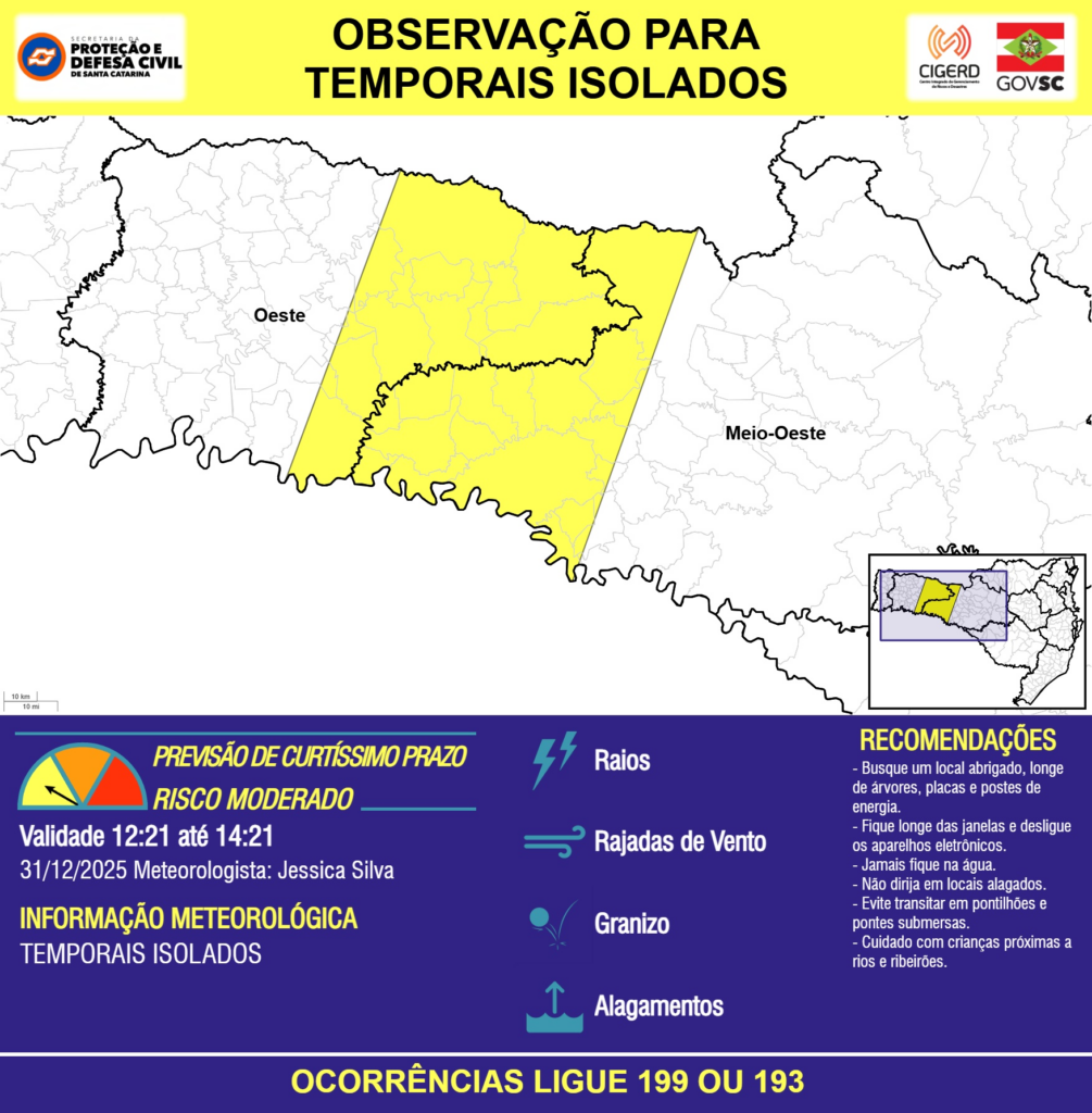 OBSERVAÇÃO – 31/12 12:21 – TEMPORAIS ISOLADOS com RAIOS, RAJADAS DE VENTO, GRANIZO e ALAGAMENTOS pontuais para as regiões do Oeste e Meio-Oeste nas próximas 2 horas. Ocorrências ligue 199 ou 193.