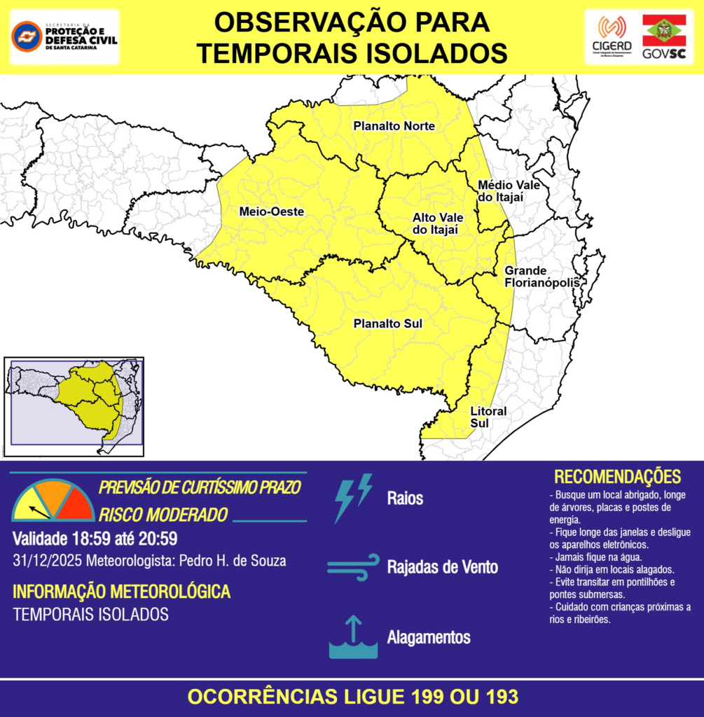 OBSERVAÇÃO – 31/12 18:59 – TEMPORAIS ISOLADOS com RAIOS, RAJADAS DE VENTO e ALAGAMENTOS pontuais para áreas das regiões do Meio-Oeste, Planalto Norte, Planalto Sul, Litoral Sul, Grande Florianópolis, Médio e Alto Vale do Itajaí nas próximas 2 horas. Ocorrências ligue 199 ou 193.