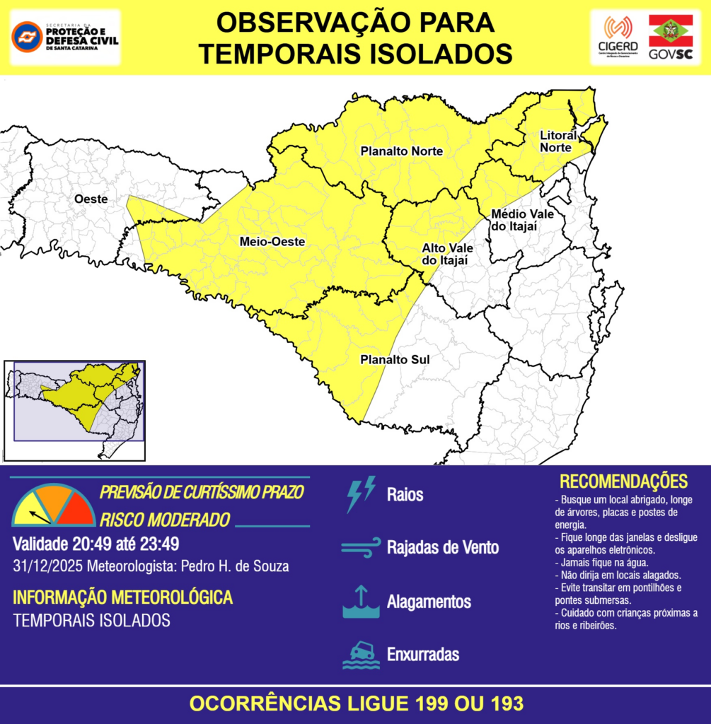 OBSERVAÇÃO – 31/12 20:49 – TEMPORAIS ISOLADOS com RAIOS, RAJADAS DE VENTO, ALAGAMENTOS pontuais e risco de ENXURRADAS para áreas das regiões do Oeste, Meio-Oeste, Planalto Norte, Litoral Norte, Planalto Sul, Médio e Alto Vale do Itajaí nas próximas 3 horas. Ocorrências ligue 199 ou 193.