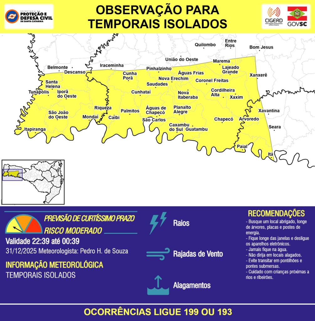 OBSERVAÇÃO – 31/12 22:39 – TEMPORAIS ISOLADOS com RAIOS, RAJADAS DE VENTO e ALAGAMENTOS pontuais para áreas das regiões do Extremo Oeste, Oeste e Meio-Oeste nas próximas 2 horas. Ocorrências ligue 199 ou 193.