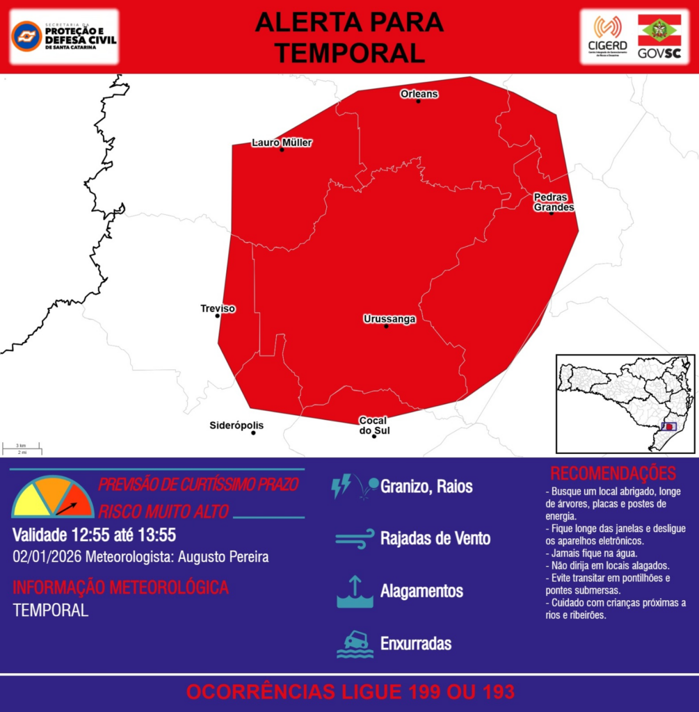 ALERTA – 02/01 12:55 – TEMPORAL com RAJADAS DE VENTO, ALAGAMENTOS, GRANIZO, RAIOS e risco de ENXURRADAS para os municípios de Cocal do Sul, Lauro Müller, Orleans, Pedras Grandes, Siderópolis, Treviso e Urussanga na próxima hora. Ocorrências ligue 199 ou 193.