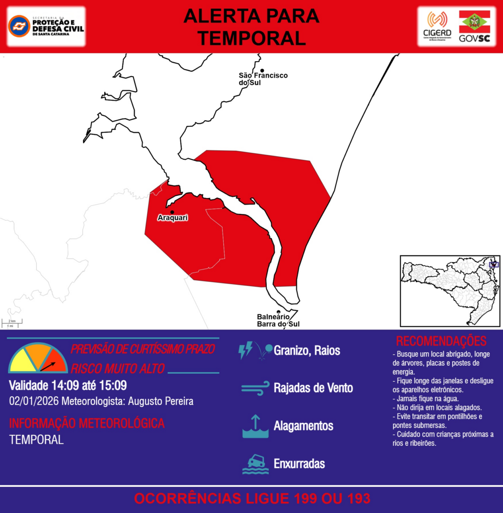 ALERTA – 02/01 14:09 – TEMPORAL com RAJADAS DE VENTO, ALAGAMENTOS, GRANIZO, RAIOS e risco de ENXURRADAS para os municípios de Araquari, Balneário Barra do Sul e São Francisco do Sul na próxima hora. Ocorrências ligue 199 ou 193.