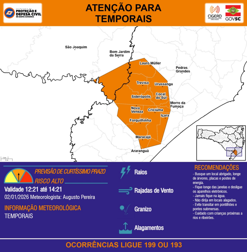 ATENÇÃO – 02/01 12:21 – TEMPORAIS com RAIOS, RAJADAS DE VENTO, GRANIZO e ALAGAMENTOS para os municípios de Araranguá, Bom Jardim da Serra, Cocal do Sul, Criciúma, Forquilhinha, Içara, Lauro Müller, Maracajá, Morro da Fumaça, Nova Veneza, Pedras Grandes, Siderópolis, São Joaquim, Treviso e Urussanga nas próximas 2 horas. Ocorrências ligue 199 ou 193.