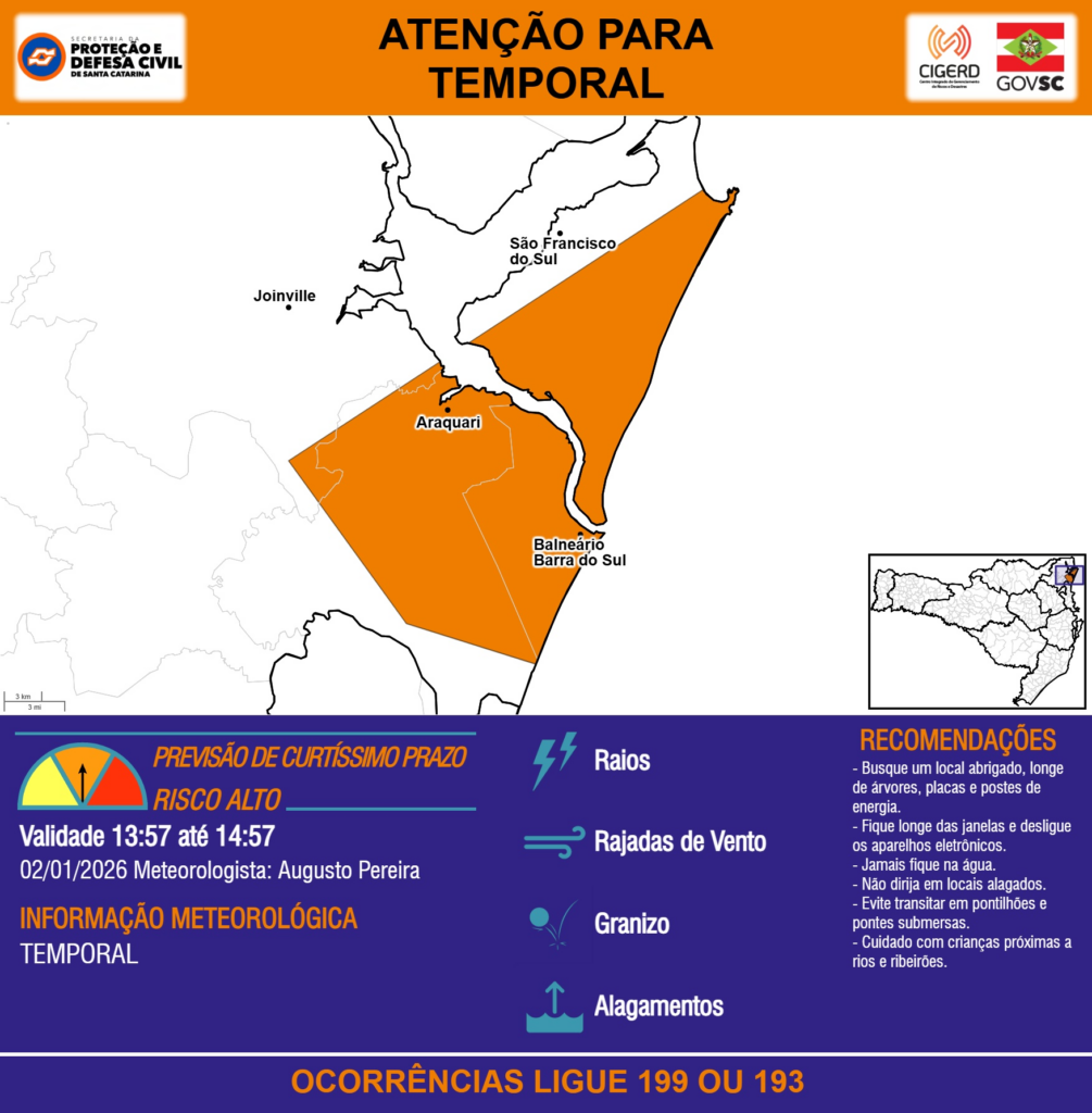 ATENÇÃO – 02/01 13:57 – TEMPORAL com RAIOS, RAJADAS DE VENTO, GRANIZO e ALAGAMENTOS para os municípios de Araquari, Balneário Barra do Sul, Joinville e São Francisco do Sul na próxima hora. Ocorrências ligue 199 ou 193.