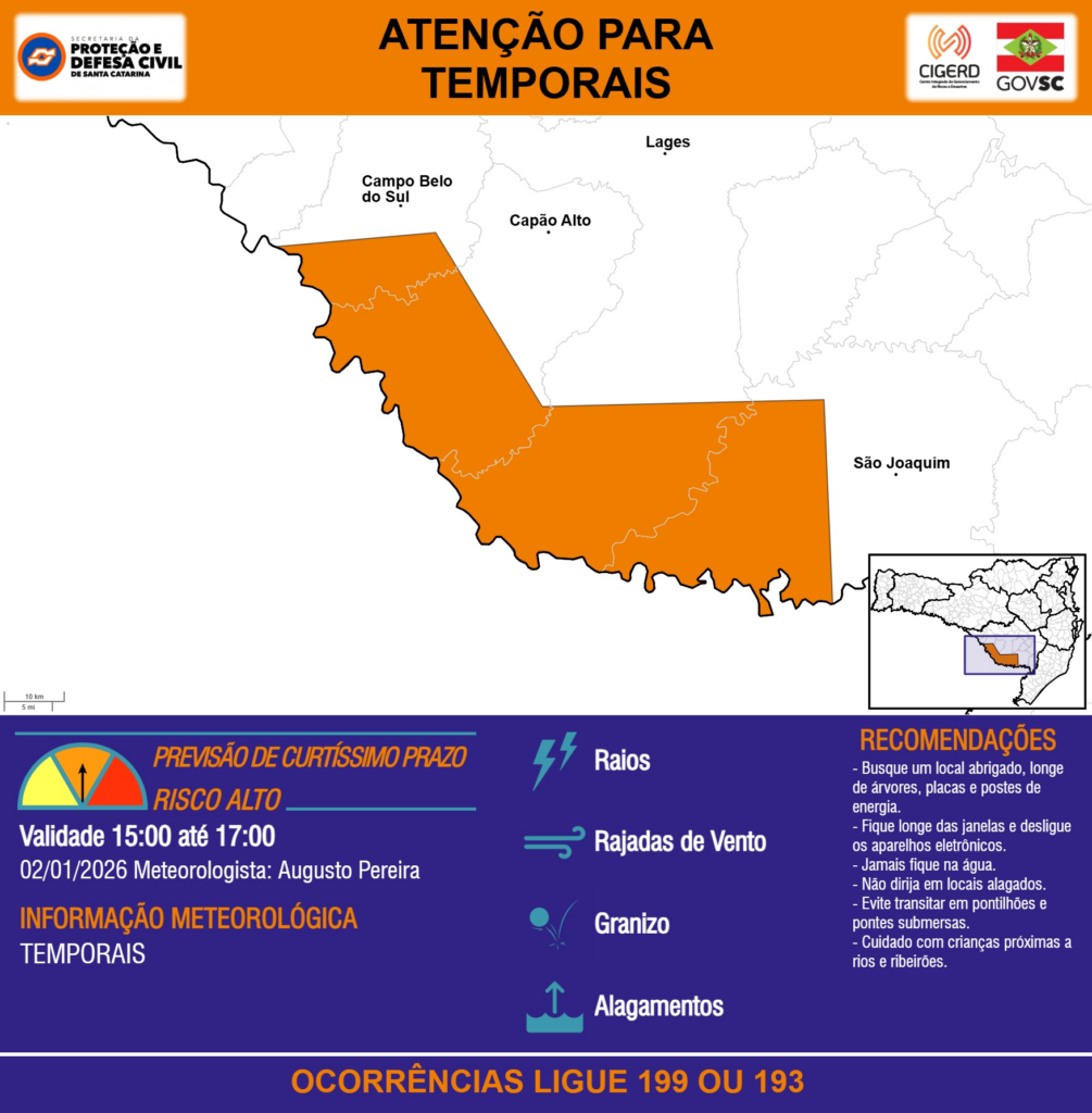 ATENÇÃO – 02/01 15:00 – TEMPORAIS com RAIOS, RAJADAS DE VENTO, GRANIZO e ALAGAMENTOS para os municípios de Campo Belo do Sul, Capão Alto, Lages e São Joaquim nas próximas 2 horas. Ocorrências ligue 199 ou 193.