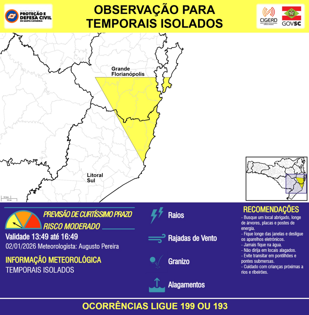 OBSERVAÇÃO – 02/01 13:49 – TEMPORAIS ISOLADOS com RAIOS, RAJADAS DE VENTO, GRANIZO e ALAGAMENTOS pontuais para as regiões do Litoral Sul, Grande Florianópolis e Alto Vale do Itajaí nas próximas 3 horas. Ocorrências ligue 199 ou 193.