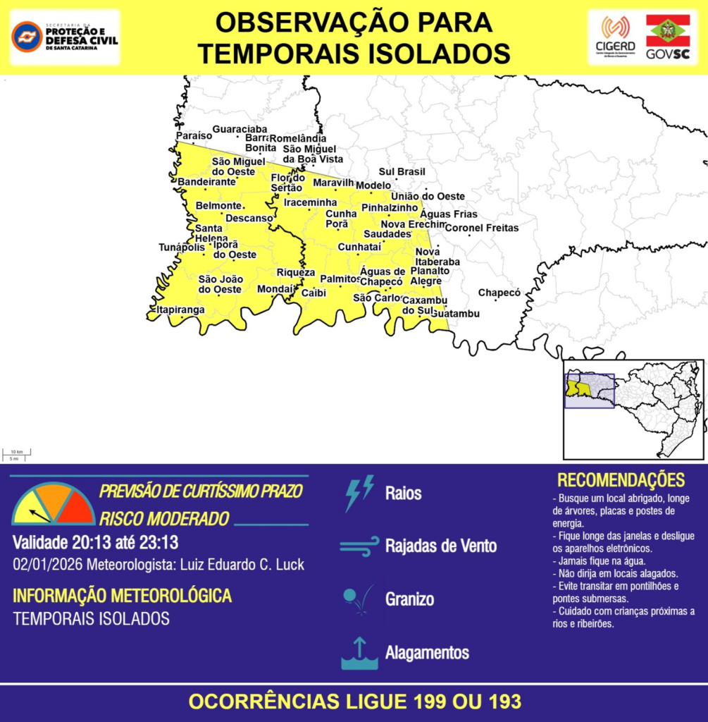 OBSERVAÇÃO – 02/01 20:13 – TEMPORAIS ISOLADOS com RAIOS, RAJADAS DE VENTO, GRANIZO e ALAGAMENTOS pontuais para as regiões do Extremo Oeste e Oeste nas próximas 3 horas. Ocorrências ligue 199 ou 193.