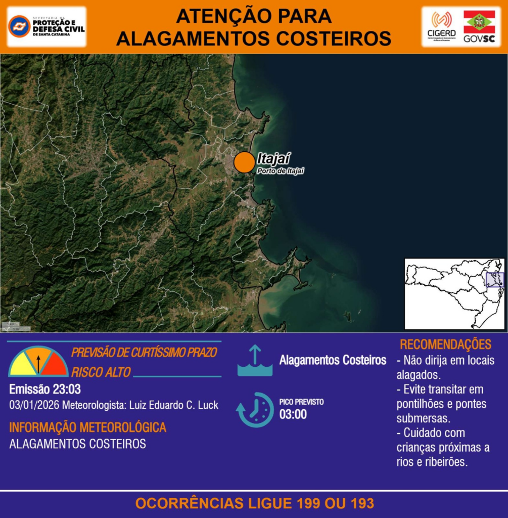 ATENÇÃO – 03/01 23:03 – ALAGAMENTOS COSTEIROS nas próximas horas devido à maré alta para o município de Itajaí. Pico previsto às 03:00 h. Ocorrências ligue 199 ou 193.