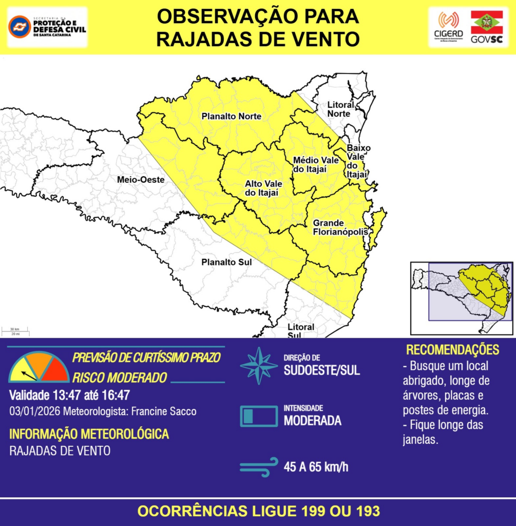 OBSERVAÇÃO – 03/01 13:47 – RAJADAS DE VENTO de quadrante sudoeste/sul, com intensidade MODERADA (45 a 65 km/h), para as regiões do Meio-Oeste, Planalto Norte, Litoral Norte, Planalto Sul, Litoral Sul, Grande Florianópolis, Baixo, Médio e Alto Vale do Itajaí nas próximas 3 horas. Ocorrências ligue 199 ou 193.