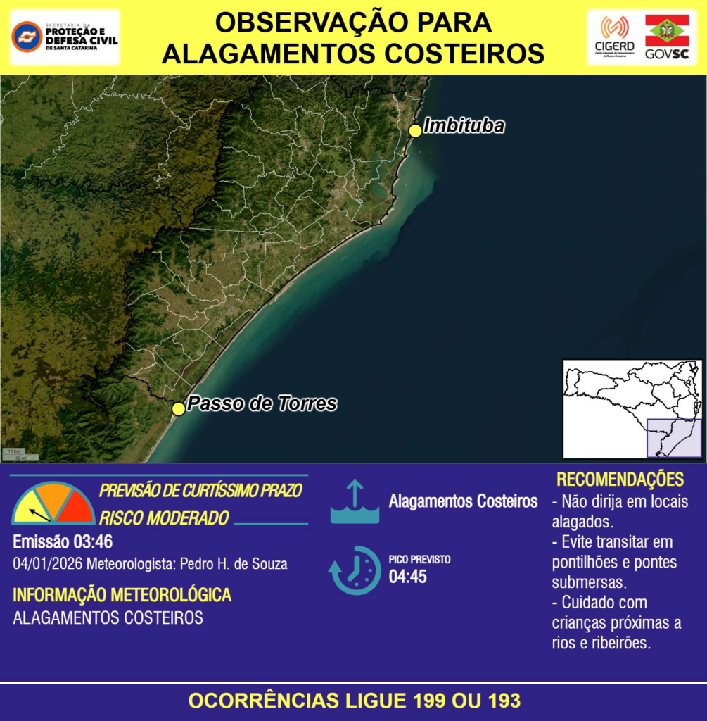OBSERVAÇÃO – 04/01 03:46 – ALAGAMENTOS COSTEIROS nas próximas horas devido à maré alta para os municípios de Imbituba e Passo de Torres. Pico previsto às 04:45h. Ocorrências ligue 199 ou 193.