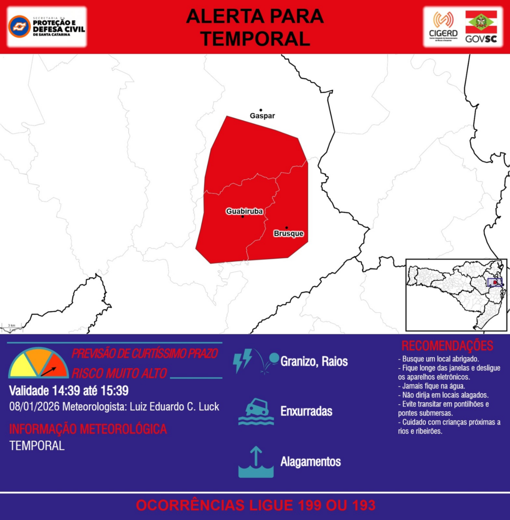 ALERTA – 08/01 14:39 – TEMPORAL com ALAGAMENTOS, GRANIZO, RAIOS e risco de ENXURRADAS para os municípios de Brusque, Gaspar e Guabiruba na próxima hora. Ocorrências ligue 199 ou 193.