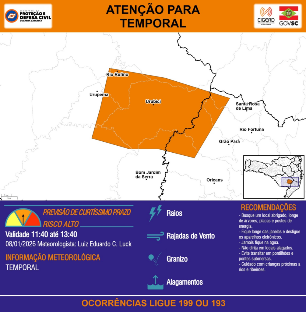 ATENÇÃO – 08/01 11:40 – TEMPORAL com RAIOS, RAJADAS DE VENTO, GRANIZO e ALAGAMENTOS para os municípios de Bom Jardim da Serra, Grão Pará, Orleans, Rio Fortuna, Rio Rufino, Santa Rosa de Lima, Urubici e Urupema nas próximas 2 horas. Ocorrências ligue 199 ou 193.