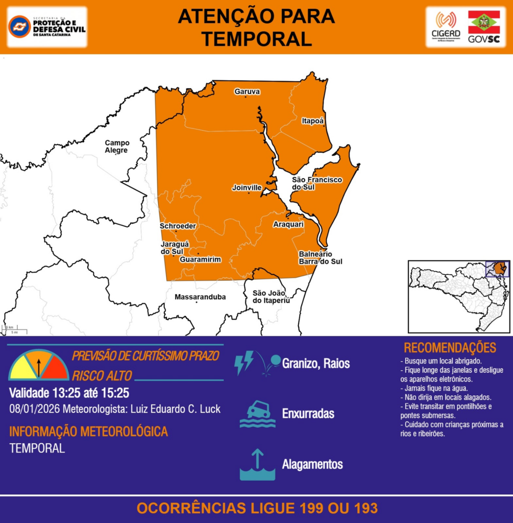 ATENÇÃO – 08/01 13:25 – TEMPORAL com ALAGAMENTOS, GRANIZO, RAIOS e risco de ENXURRADAS para os municípios de Araquari, Balneário Barra do Sul, Campo Alegre, Garuva, Guaramirim, Itapoá, Jaraguá do Sul, Joinville, Massaranduba, Schroeder, São Francisco do Sul e São João do Itaperiú nas próximas 2 horas. Ocorrências ligue 199 ou 193.
