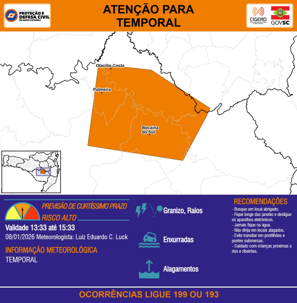 ATENÇÃO – 08/01 13:33 – TEMPORAL com ALAGAMENTOS, GRANIZO, RAIOS e risco de ENXURRADAS para os municípios de Bocaina do Sul, Otacílio Costa, Palmeira nas próximas 2 horas. Ocorrências ligue 199 ou 193.
