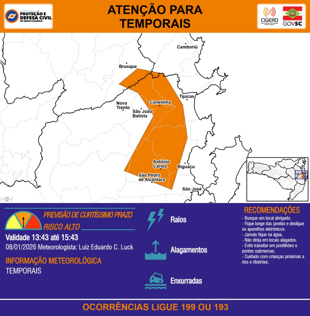 ATENÇÃO – 08/01 13:43 – TEMPORAIS com RAIOS, ALAGAMENTOS e risco de ENXURRADAS para os municípios de Antônio Carlos, Biguaçu, Brusque, Camboriú, Canelinha, Nova Trento, São José, São João Batista, São Pedro de Alcântara e Tijucas nas próximas 2 horas. Ocorrências ligue 199 ou 193.