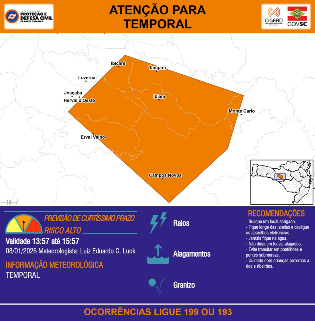 ATENÇÃO – 08/01 13:57 – TEMPORAL com RAIOS, ALAGAMENTOS e GRANIZO para os municípios de Campos Novos, Erval Velho, Herval d’Oeste, Ibiam, Ibicaré, Joaçaba, Luzerna, Monte Carlo, Tangará, Treze Tílias e Água Doce nas próximas 2 horas. Ocorrências ligue 199 ou 193.