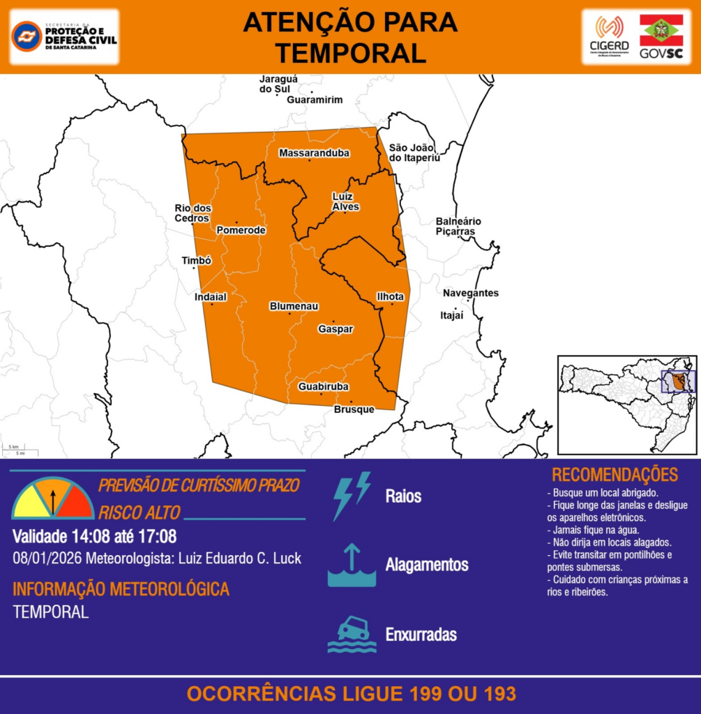 ATENÇÃO – 08/01 14:08 – TEMPORAL com RAIOS, ALAGAMENTOS e risco de ENXURRADAS para os municípios de Balneário Piçarras, Blumenau, Brusque, Gaspar, Guabiruba, Guaramirim, Ilhota, Indaial, Itajaí, Jaraguá do Sul, Luiz Alves, Massaranduba, Navegantes, Pomerode, Rio dos Cedros, São João do Itaperiú e Timbó nas próximas 3 horas. Ocorrências ligue 199 ou 193.