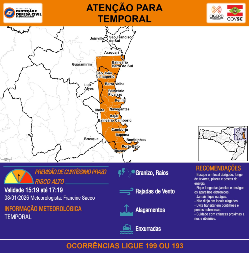 ATENÇÃO – 08/01 15:19 – TEMPORAL com RAJADAS DE VENTO, ALAGAMENTOS, GRANIZO, RAIOS e risco de ENXURRADAS para as regiões do Litoral Norte, Grande Florianópolis, Baixo e Médio Vale do Itajaí nas próximas 2 horas. Ocorrências ligue 199 ou 193.