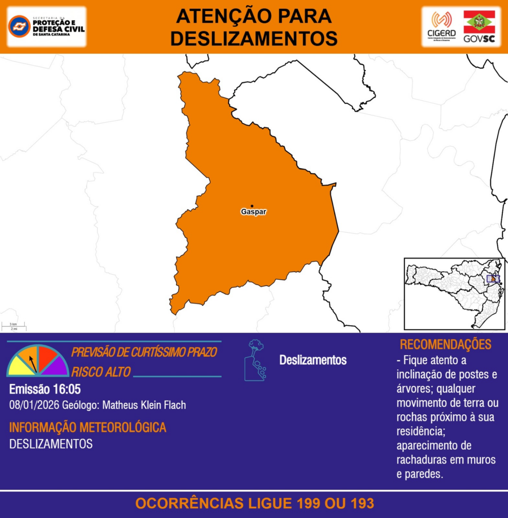 ATENÇÃO – 08/01 16:05 – DESLIZAMENTOS para o município de Gaspar. Ocorrências ligue 199 ou 193.