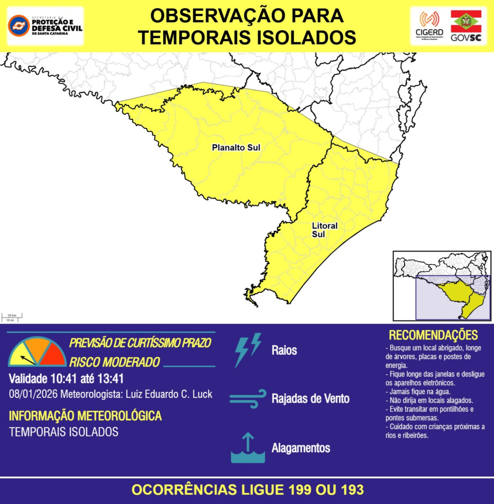 OBSERVAÇÃO – 08/01 10:41 – TEMPORAIS ISOLADOS com RAIOS, RAJADAS DE VENTO e ALAGAMENTOS pontuais para as regiões do Meio-Oeste, Planalto Sul e Litoral Sul nas próximas 3 horas. Ocorrências ligue 199 ou 193.