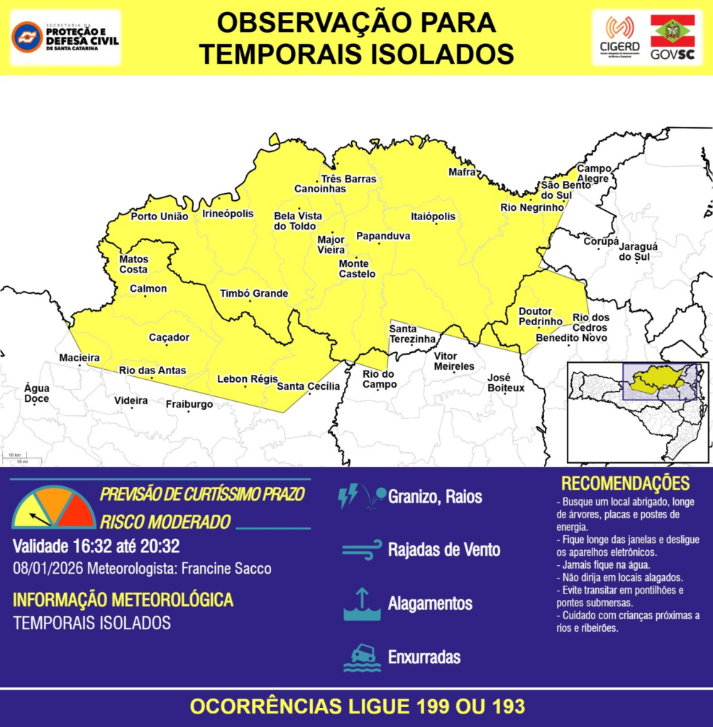 OBSERVAÇÃO – 08/01 16:32 – TEMPORAIS ISOLADOS com RAJADAS DE VENTO, GRANIZO, RAIOS, ALAGAMENTOS pontuais e risco de ENXURRADAS para as regiões do Meio-Oeste, Planalto Norte, Litoral Norte, Médio e Alto Vale do Itajaí nas próximas 4 horas. Ocorrências ligue 199 ou 193.