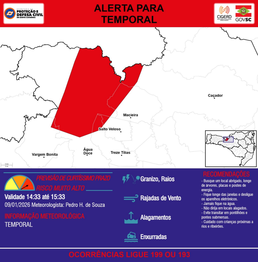 ALERTA – 09/01 14:33 – TEMPORAL com RAJADAS DE VENTO, ALAGAMENTOS, GRANIZO, RAIOS e risco de ENXURRADAS para os municípios de Caçador, Macieira, Salto Veloso, Treze Tílias, Vargem Bonita e Água Doce na próxima hora. Ocorrências ligue 199 ou 193.