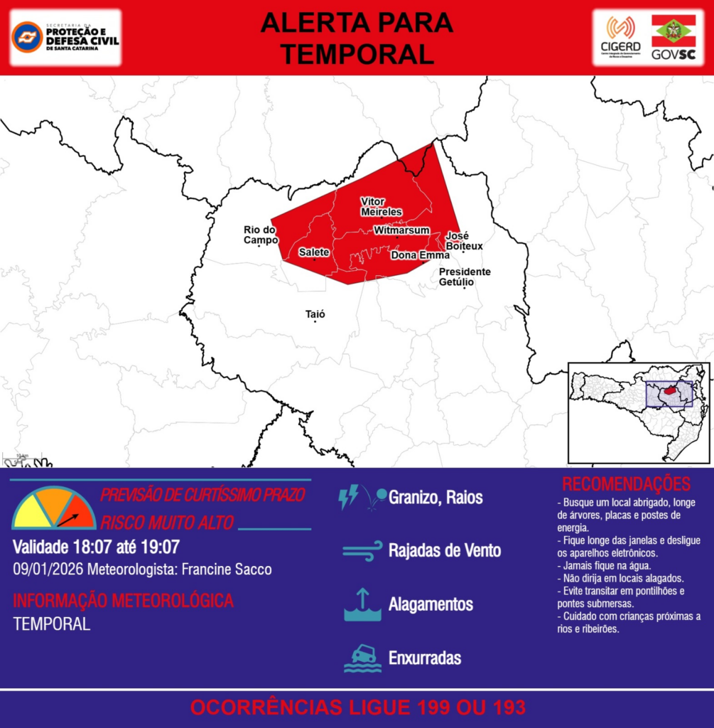 ALERTA – 09/01 18:07 – TEMPORAL com RAJADAS DE VENTO, ALAGAMENTOS, GRANIZO, RAIOS e risco de ENXURRADAS para a região do Alto Vale do Itajaí na próxima hora. Ocorrências ligue 199 ou 193.
