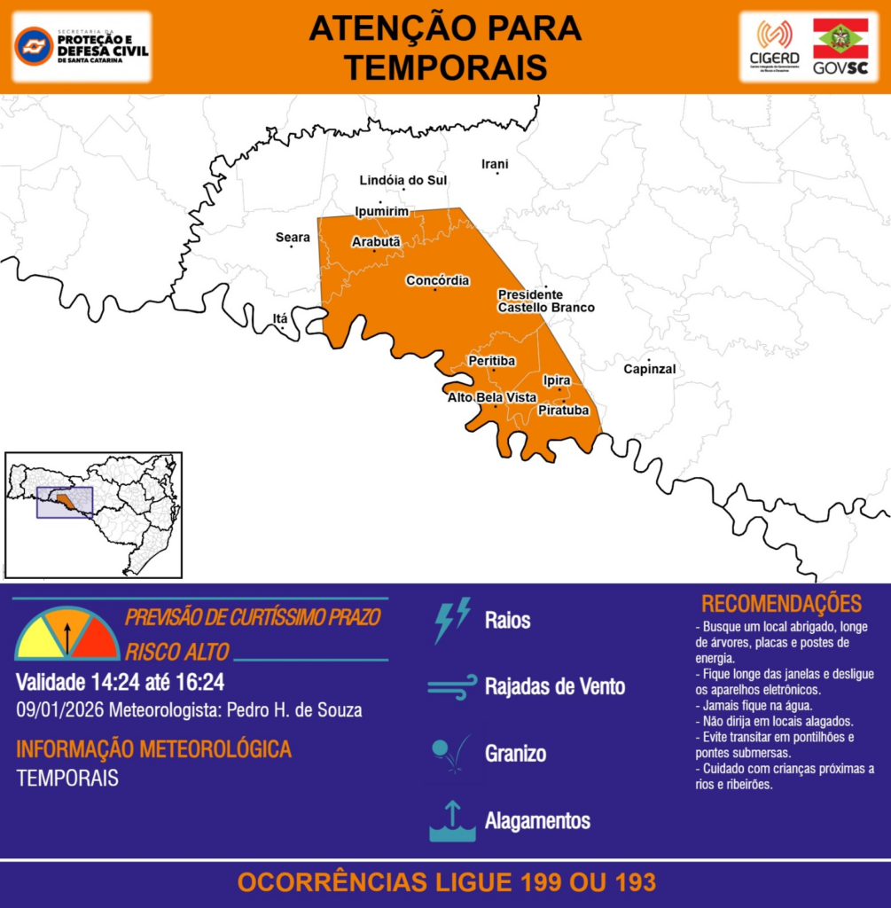 ATENÇÃO – 09/01 14:24 – TEMPORAIS com RAIOS, RAJADAS DE VENTO, GRANIZO e ALAGAMENTOS para os municípios de Alto Bela Vista, Arabutã, Capinzal, Concórdia, Ipira, Ipumirim, Irani, Itá, Lindóia do Sul, Peritiba, Piratuba, Presidente Castello Branco e Seara nas próximas 2 horas. Ocorrências ligue 199 ou 193.