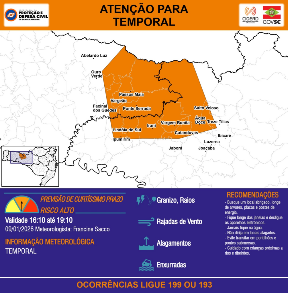 ATENÇÃO – 09/01 16:10 – TEMPORAL com RAJADAS DE VENTO, ALAGAMENTOS, GRANIZO, RAIOS e risco de ENXURRADAS para as regiões do Oeste e Meio-Oeste nas próximas 3 horas. Ocorrências ligue 199 ou 193.