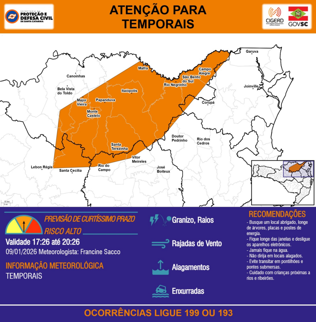 ATENÇÃO – 09/01 17:26 – TEMPORAIS com RAJADAS DE VENTO, ALAGAMENTOS, GRANIZO, RAIOS e risco de ENXURRADAS para as regiões do Meio-Oeste, Planalto Norte, Litoral Norte, Médio e Alto Vale do Itajaí nas próximas 3 horas. Ocorrências ligue 199 ou 193.