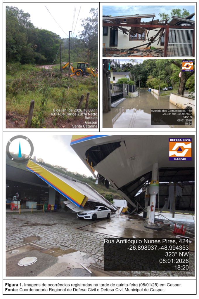 Durante a tarde desta quinta-feira (08), o forte calor, combinado com a atuação de uma frente fria no oceano, favoreceu a formação de tempestades severas no Vale do Itajaí. A tempestade que atingiu o município de Gaspar teve origem no norte da cidade vizinha de Blumenau e, ao se deslocar em direção a Gaspar, uniu-se a outro núcleo convectivo, ganhando ainda mais intensidade. Esse processo resultou em chuva extremamente intensa, provocando alagamentos e enxurradas em diversos pontos do município.