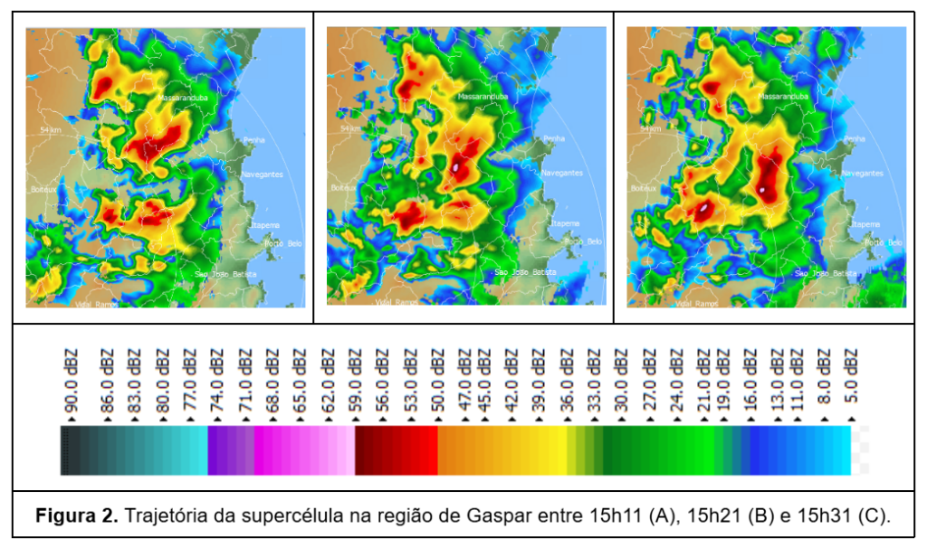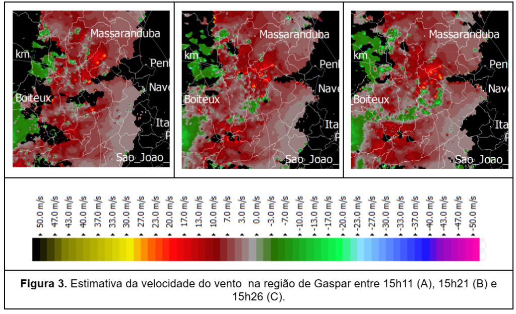 Assim como descrito anteriormente, essa tempestade, caracterizada como supercélula (tempestade severa) se formou no norte de Blumenau e ganhou força ao se aproximar do município de Gaspar. Essa trajetória é observada na sequência de imagens do radar meteorológico do Vale (Figura 2). Os tons em vermelho e rosa indicam o momento onde a tempestade estava mais intensa, com maior potencial para ventos fortes, granizo e microexplosões. As imagens mostram um núcleo compacto e muito intenso de refletividade (tons de vermelho/magenta) na região de Gaspar ao longo de 15h11-15h31.