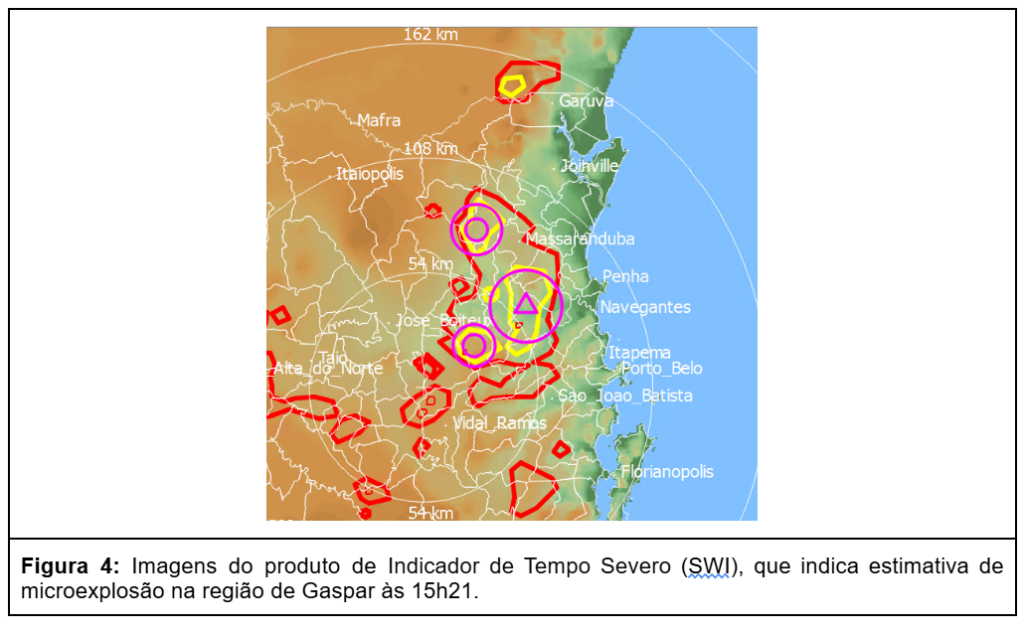 O Indicador de Tempo Severo (SWI) destaca a tempestade em vermelho e o núcleo mais intenso em amarelo sobre a região de Gaspar (Figura 4). Em 15h21, aparece o marcador de microexplosão em rosa, com círculos dentro do círculo indicando a área mais provável do fenômeno. O triângulo dentro do círculo reforça o indicativo específico de microexplosão associado ao núcleo de tempestade. A coincidência espacial e temporal entre núcleo severo e sinal do SWI confirma o suporte observacional para microexplosão.