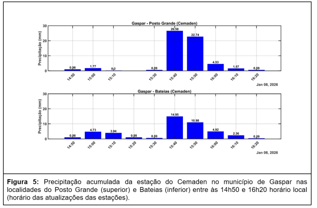 Os pluviômetros do Cemaden em Gaspar (Figura 5) registraram aumento brusco da precipitação em curto intervalo de tempo. No Posto Grande, destaca-se acumulado de 27 mm às 15h40 e 23 mm às 15h50, enquanto em Bateias os máximos atingem 15 mm e 11 mm nos mesmos horários. Esse padrão concentrado e intenso é compatível com uma tempestade severa.