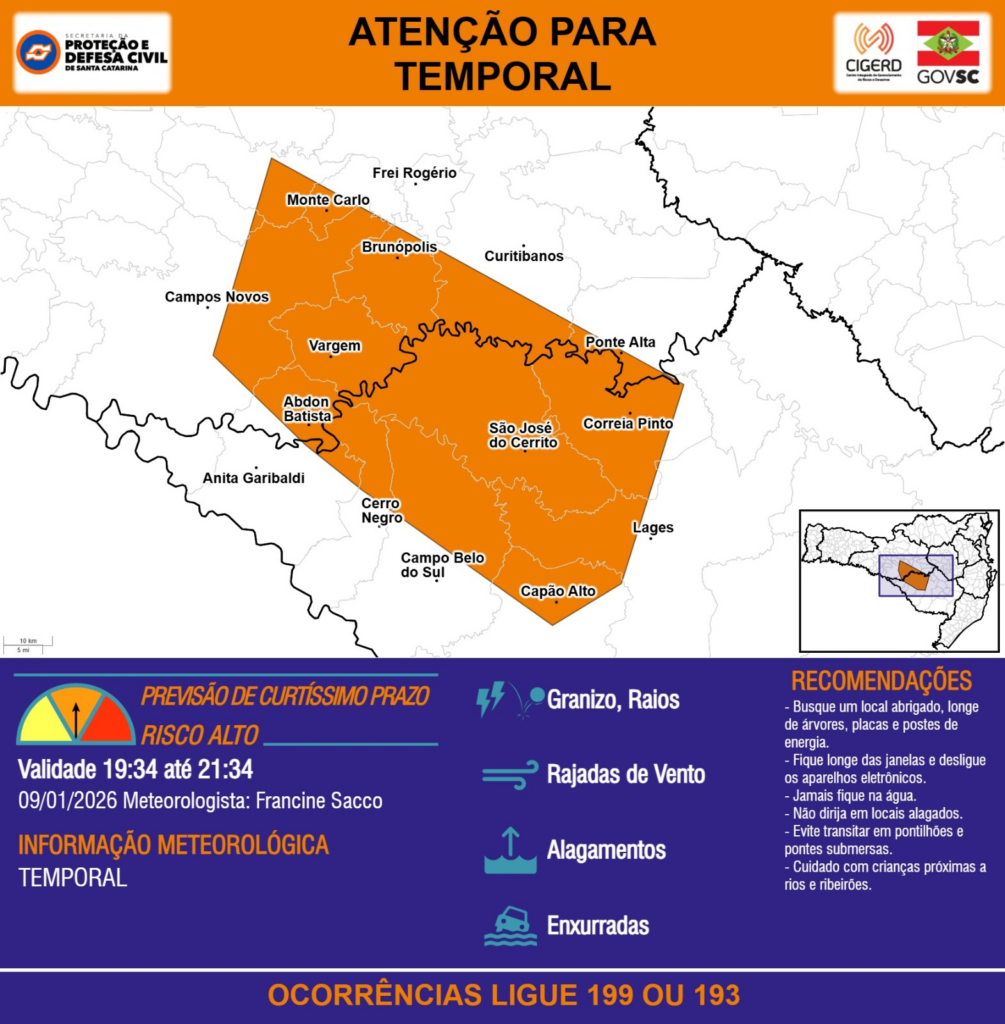ATENÇÃO – 09/01 19:34 – TEMPORAL com RAJADAS DE VENTO, ALAGAMENTOS, GRANIZO, RAIOS e risco de ENXURRADAS para as regiões do Meio-Oeste e Planalto Sul nas próximas 2 horas. Ocorrências ligue 199 ou 193.