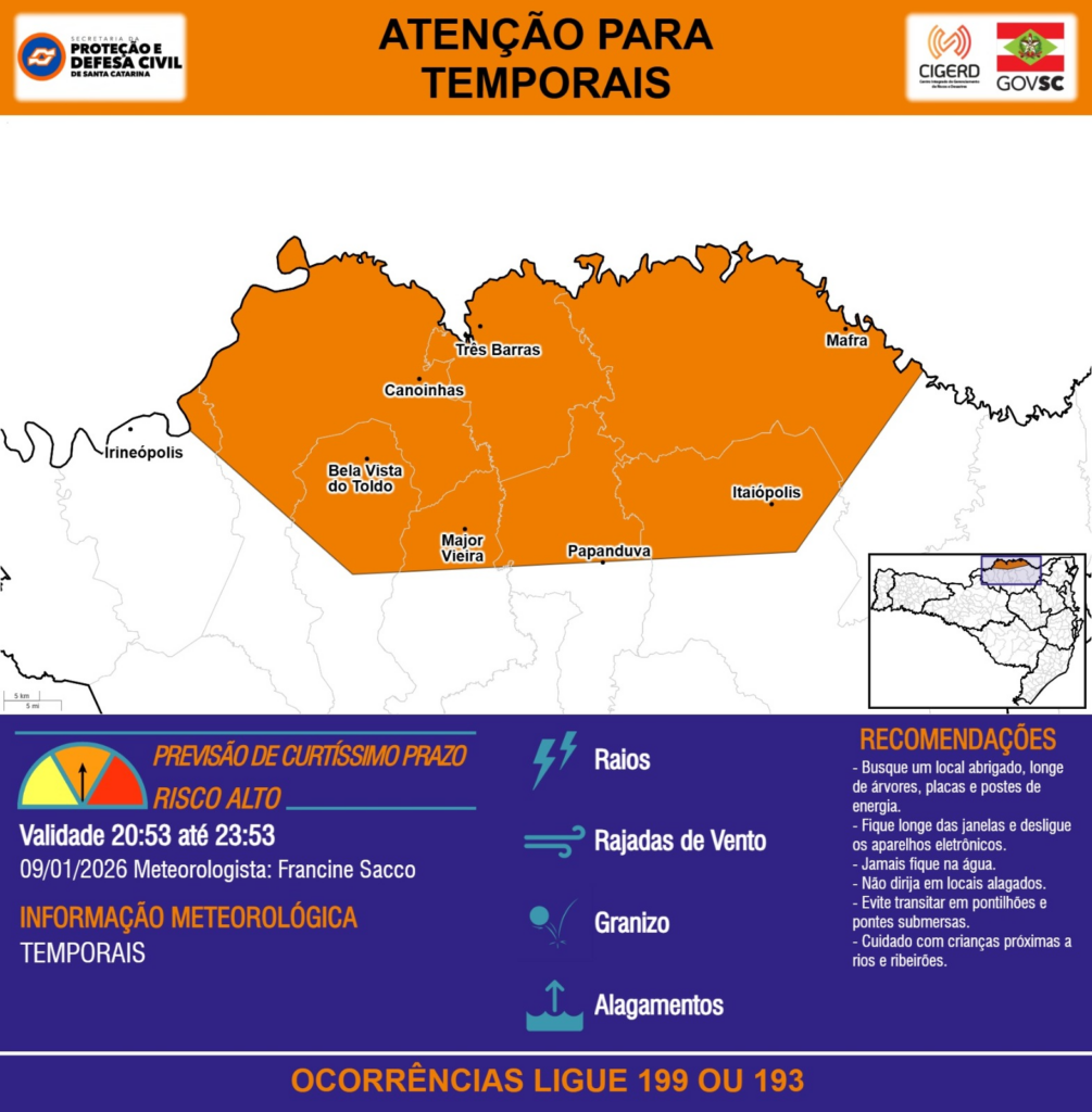 ATENÇÃO – 09/01 20:53 – TEMPORAIS com RAIOS, RAJADAS DE VENTO, GRANIZO e ALAGAMENTOS para a região do Planalto Norte nas próximas 3 horas. Ocorrências ligue 199 ou 193.
