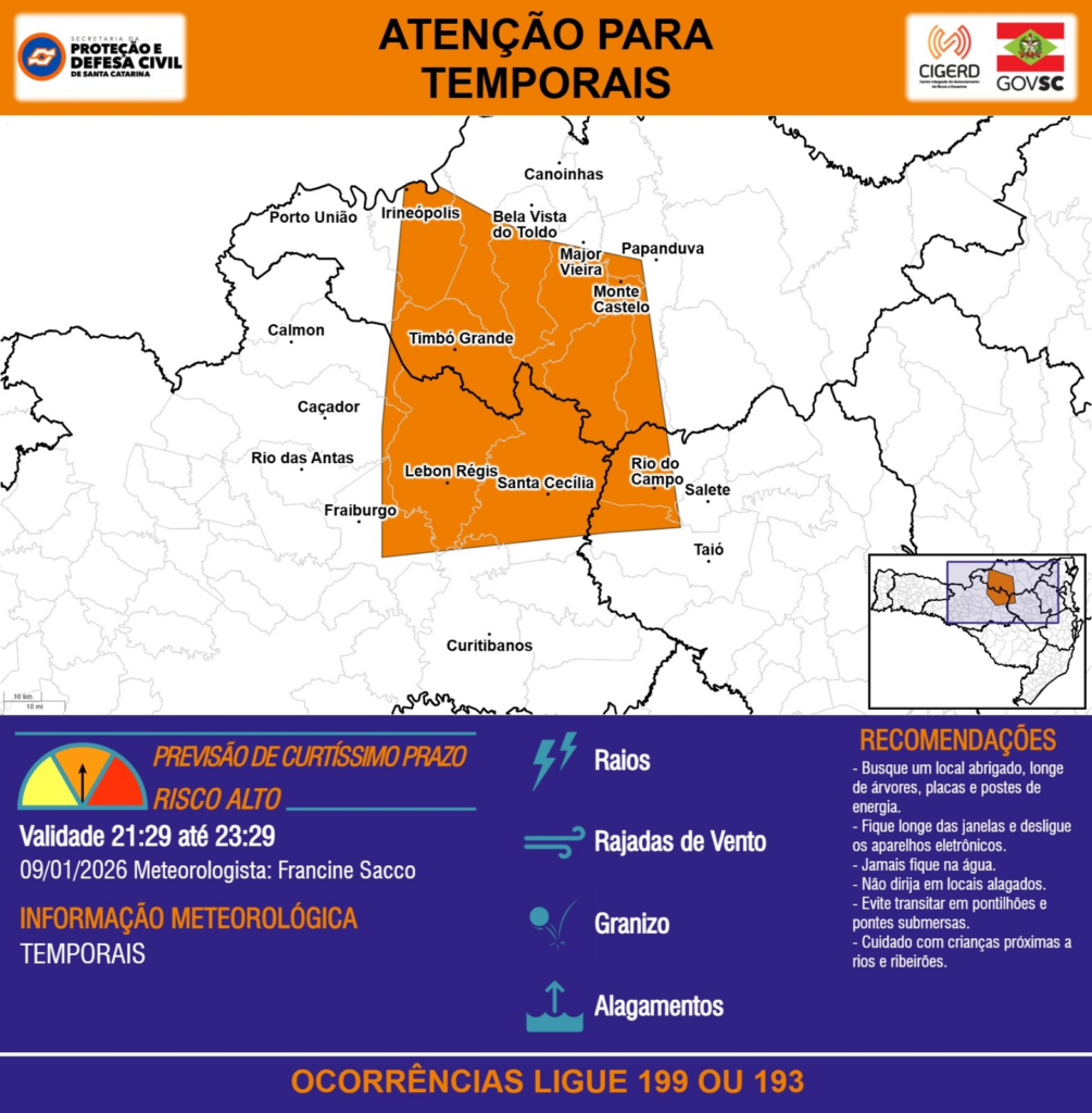 ATENÇÃO – 09/01 21:29 – TEMPORAIS com RAIOS, RAJADAS DE VENTO, GRANIZO e ALAGAMENTOS para as regiões do Meio-Oeste, Planalto Norte e Alto Vale do Itajaí nas próximas 2 horas. Ocorrências ligue 199 ou 193.
