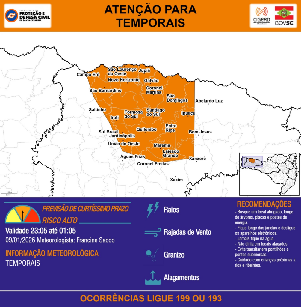 ATENÇÃO – 09/01 23:05 – TEMPORAIS com RAIOS, RAJADAS DE VENTO, GRANIZO e ALAGAMENTOS para a região do Oeste nas próximas 2 horas. Ocorrências ligue 199 ou 193.