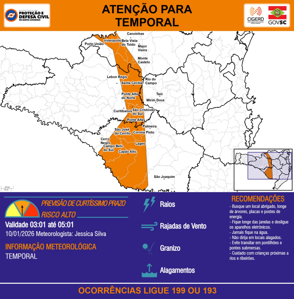 ATENÇÃO – 10/01 03:01 – TEMPORAL com RAIOS, RAJADAS DE VENTO, GRANIZO e ALAGAMENTOS para os municípios de Bela Vista do Toldo, Campo Belo do Sul, Canoinhas, Capão Alto, Cerro Negro, Correia Pinto, Curitibanos, Irineópolis, Lages, Lebon Régis, Major Vieira, Mirim Doce, Monte Castelo, Palmeira, Ponte Alta, Ponte Alta do Norte, Porto União, Rio do Campo, Santa Cecília, São Cristóvão do Sul, São Joaquim, São José do Cerrito e Taió nas próximas 2 horas. Ocorrências ligue 199 ou 193.