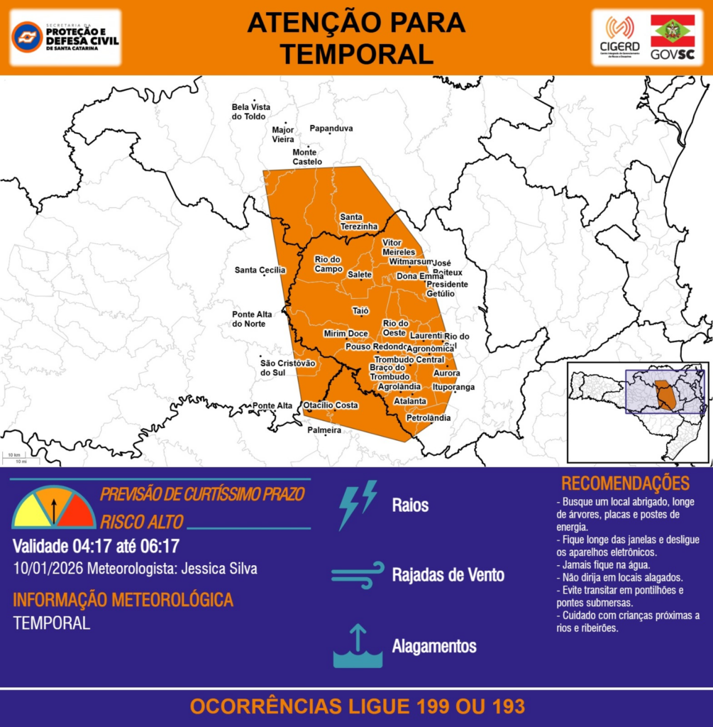 ATENÇÃO – 10/01 04:17 – TEMPORAL com RAIOS, RAJADAS DE VENTO e ALAGAMENTOS para os municípios de Agrolândia, Agronômica, Atalanta, Aurora, Bela Vista do Toldo, Braço do Trombudo, Dona Emma, Ituporanga, José Boiteux, Laurentino, Major Vieira, Mirim Doce, Monte Castelo, Otacílio Costa, Palmeira, Papanduva, Petrolândia, Ponte Alta, Ponte Alta do Norte, Pouso Redondo, Presidente Getúlio, Rio do Campo, Rio do Oeste, Rio do Sul, Salete, Santa Cecília, Santa Terezinha, São Cristóvão do Sul, Taió, Trombudo Central, Vitor Meireles e Witmarsum nas próximas 2 horas. Ocorrências ligue 199 ou 193.