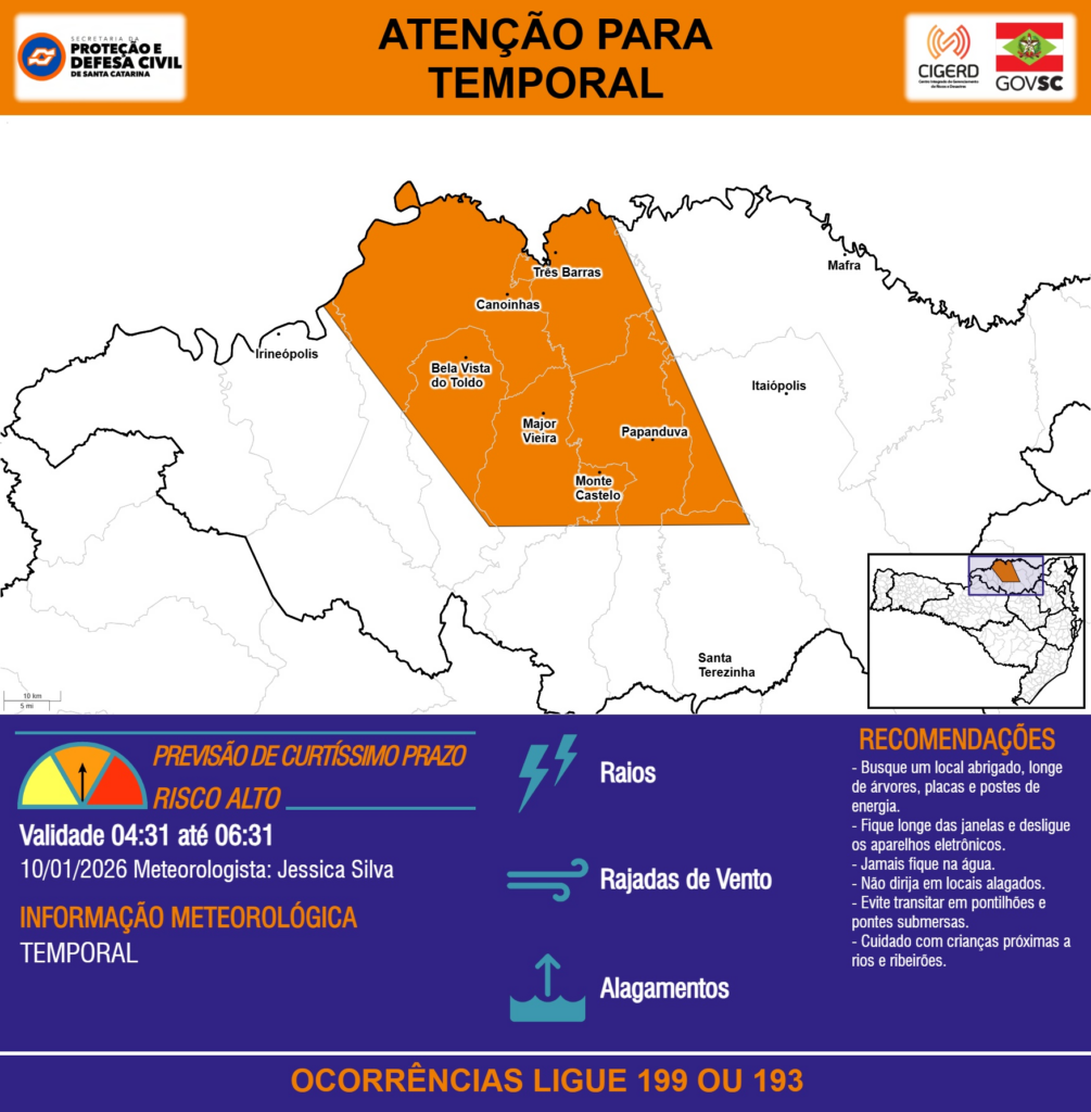 ATENÇÃO – 10/01 04:31 – TEMPORAL com RAIOS, RAJADAS DE VENTO e ALAGAMENTOS para os municípios de Bela Vista do Toldo, Canoinhas, Irineópolis, Itaiópolis, Mafra, Major Vieira, Monte Castelo, Papanduva, Santa Terezinha e Três Barras nas próximas 2 horas. Ocorrências ligue 199 ou 193.