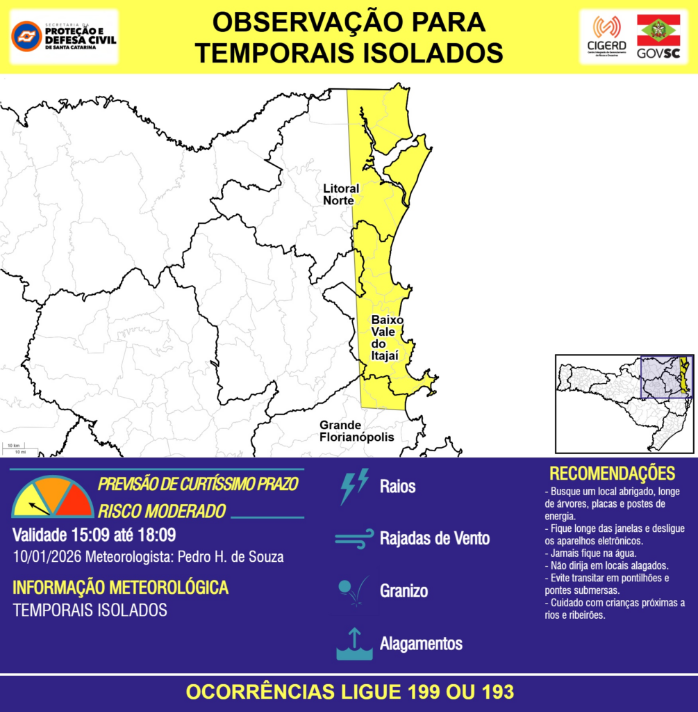 OBSERVAÇÃO – 10/01 15:09 – TEMPORAIS ISOLADOS com RAIOS, RAJADAS DE VENTO, GRANIZO e ALAGAMENTOS pontuais para áreas das regiões do Litoral Norte, Grande Florianópolis e Baixo Vale do Itajaí nas próximas 3 horas. Ocorrências ligue 199 ou 193.