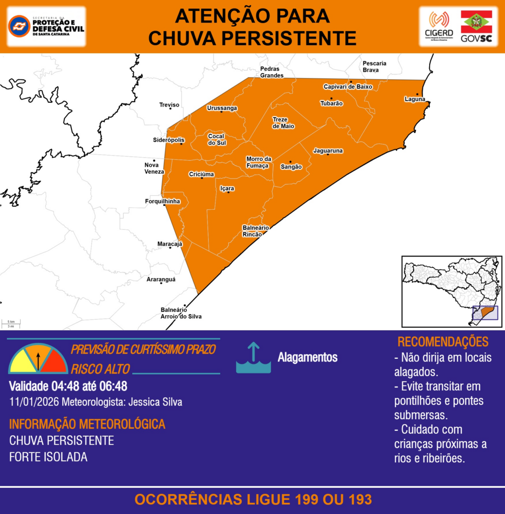 ATENÇÃO – 11/01 04:48 – CHUVA PERSISTENTE de intensidade forte isolada com ALAGAMENTOS para os municípios de Araranguá, Balneário Arroio do Silva, Balneário Rincão, Capivari de Baixo, Cocal do Sul, Criciúma, Forquilhinha, Içara, Jaguaruna, Laguna, Maracajá, Morro da Fumaça, Nova Veneza, Pedras Grandes, Pescaria Brava, Sangão, Siderópolis, Treviso, Treze de Maio, Tubarão e Urussanga nas próximas 2 horas. Ocorrências ligue 199 ou 193.v