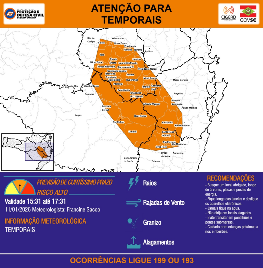 ATENÇÃO – 11/01 15:31 – TEMPORAIS com RAIOS, RAJADAS DE VENTO, GRANIZO e ALAGAMENTOS para as regiões do Meio-Oeste, Planalto Sul, Litoral Sul, Grande Florianópolis, Médio e Alto Vale do Itajaí nas próximas 2 horas. Ocorrências ligue 199 ou 193.