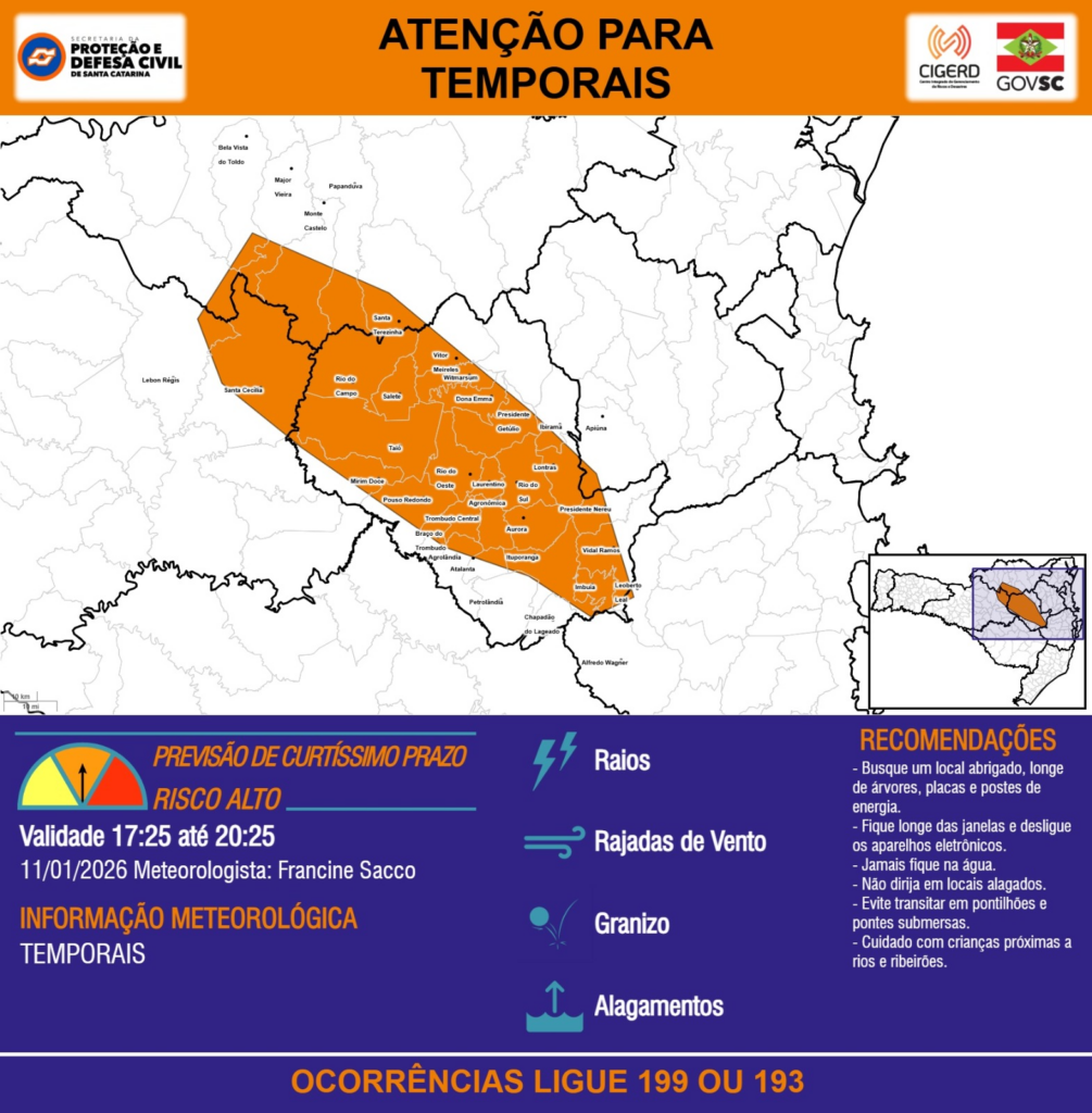 ATENÇÃO – 11/01 17:25 – TEMPORAIS com RAIOS, RAJADAS DE VENTO, GRANIZO e ALAGAMENTOS para as regiões do Meio-Oeste, Planalto Norte, Grande Florianópolis, Médio e Alto Vale do Itajaí nas próximas 3 horas. Ocorrências ligue 199 ou 193.